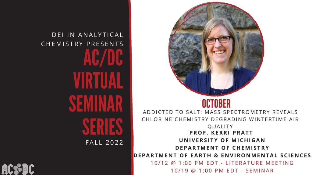 We are excited to host Dr. Kerri Pratt (University of Michigan) and her lab for the October 2022 AC/DC Seminar! Tune in Wednesday October 12th at 1 pm EDT for the literature seminar and October 19th at 1 pm EST for Dr. Pratt’s seminar!