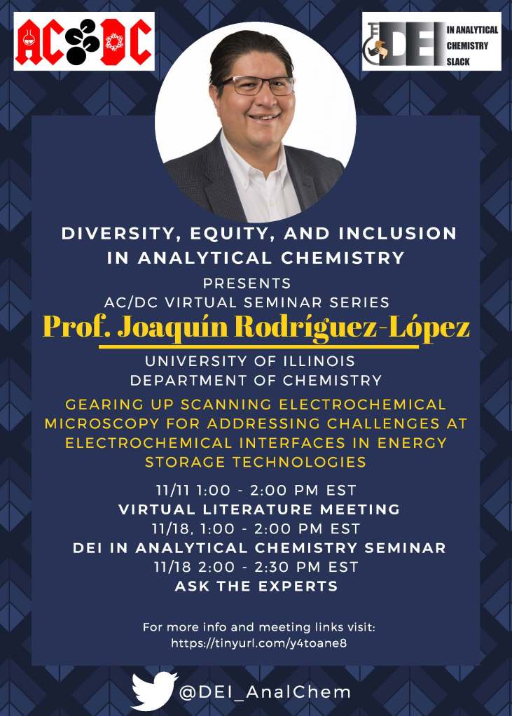 We are excited for our upcoming AC/DC Seminar scheduled for Wednesday November 18th at 1:00-2:00 PM EST with Prof. Joaquin Rodriguez Lopez from the University of Illinois Urbana Champaign! An “Ask the Experts” panel featuring students and post-docs from the JRL lab will be immediately following the talk so please stick around to engage in discussion. The week prior on Wednesday November 11th at 1:00 PM EST, we will host student’s and post-docs from the lab to lead a literature discussion. Click here to learn more about the AC/DC seminar series and to sign up for the listserv to receive meeting links.